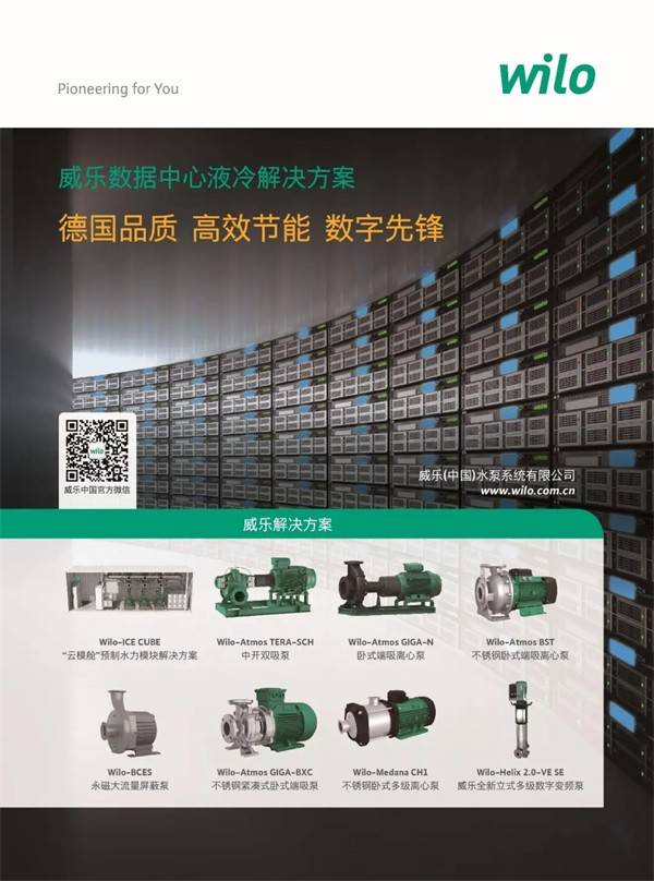 例如,针对液冷二次侧场景,威乐研发并推出了多款高效节能的绿色水泵产品,包括Wilo-Atmos GIGA-BXC系列不锈钢紧凑型端吸泵,Wilo-Medana-CH1-L系列大流量不锈钢卧式多级离心泵和Wilo-BCES系列零泄漏永磁大流量屏蔽泵,以满足不同的液冷技术及应用的需求。
