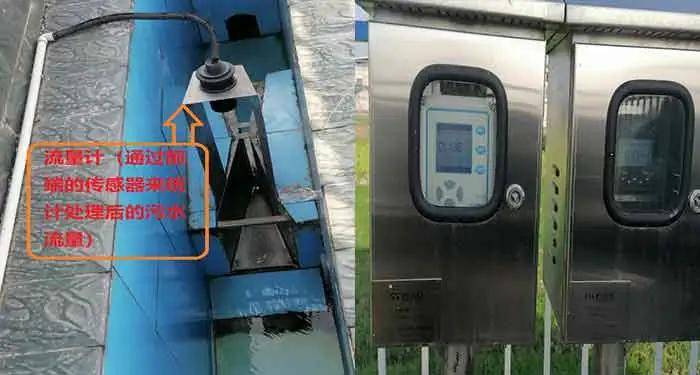 (流量计(左)检测处理后污水出水流量;SS(在线检测污水悬浮物)检测仪器(左)、PH(测试酸碱浓度)检测仪器(右))